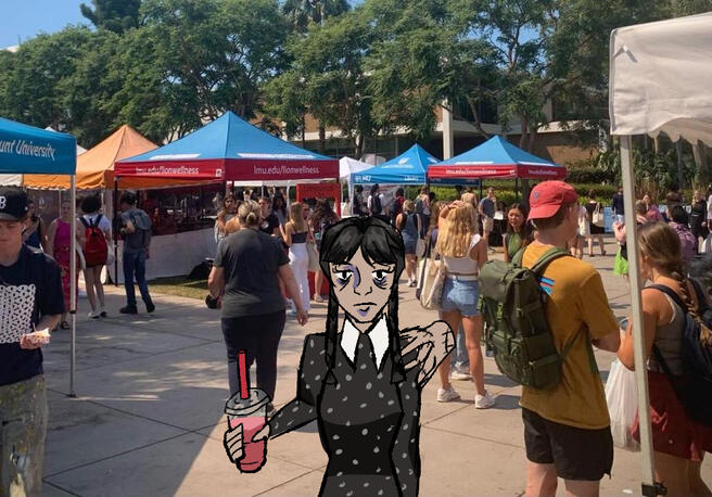Wrote and illustrated a satirical article about Wednesday Addams visiting a college community event.